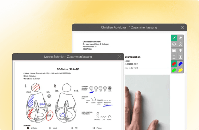 Dokumentieren, Skizzieren und Unterschreiben Sie direkt am Patienten, OP-Tisch oder Endoskop. Wir machen es Ihnen leicht, Ihre Dokumentation zu bebildern.